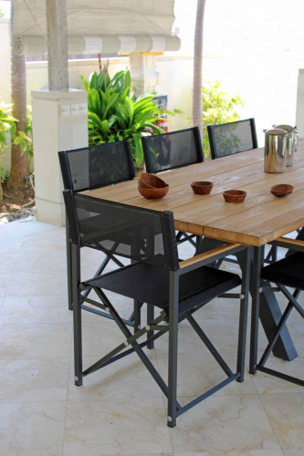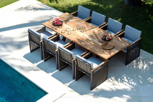 Обеденные столы Alaska со столешницей из натурального тика подчеркивают красоту коллекции Horizon, которая является одной из последних разработок испанской фабрики Skyline Design. Сочетание черного алюминия, темно-серых ремешков и подлокотников из тикового дерева создает универсальную коллекцию, идеально подходящую как городским экстерьерам, так и пространствам для отдыха.