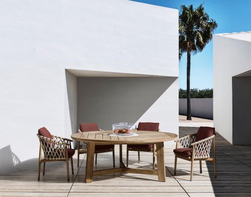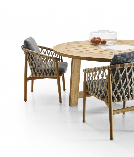 Ginestra - это коллекция больших прямоугольных и круглых обеденных столов со структурными деталями из натурального тикового дерева и дизайнерскими столешницами, разработанными с центральными вставками из белого керамогранита Calacatta. Очень прочный и функциональный обеденный стол добавляет стиль в любое пространство.