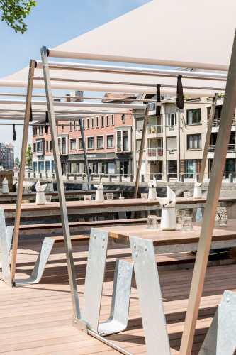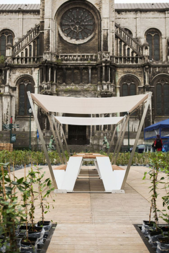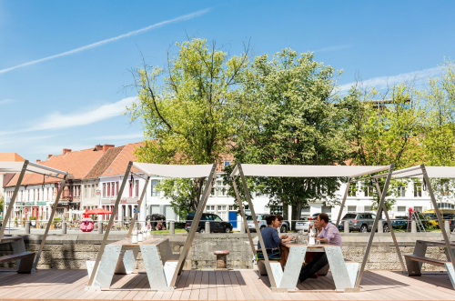 Специально для стола Hopper Picnic компания разработала солнцезащитный навес Hopper Shade, обеспечивающий много освежающей тени. Название Hopper переводится как "сборщик хмеля", что и послужило вдохновением при создании коллекции. Четко скошенные опоры навеса напоминают жерди хмелевого сада. Как в открытом, так и в закрытом состоянии Hopper Shade идеально повторяет линии стола Hopper, создавая, конечно, очень эстетичный эффект. Навес не занимает дополнительного пространства рядом со столом и обеспечивает отличную защиту от ветра благодаря своей плоской поверхности.