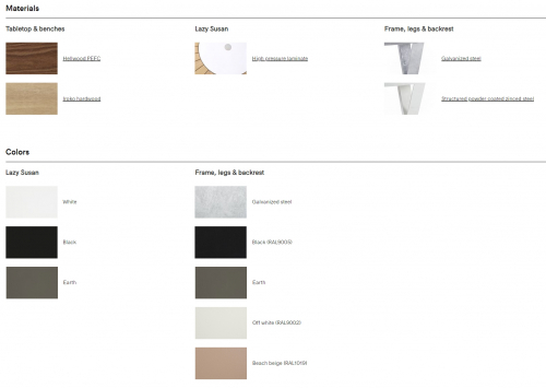 - Lazy Susan - центральная часть столешницы, которая представляет собой вращающийся поднос, выполнена из ламината высокого давления HPL - это плоская панель на основе термореактивных смол, однородно армированная древесными волокнами и изготовленная под высоким давлением и при высоких температурах. Его интегрированная поверхность основана на пигментированных смолах, отвержденных электронными лучами. Модуль упругости и высокая прочность на растяжение и изгиб гарантируют высокую ударопрочность HPL. Поверхность легко чистится. Варианты отделки: белый или черный цвет.