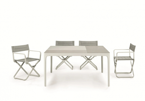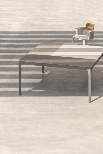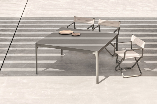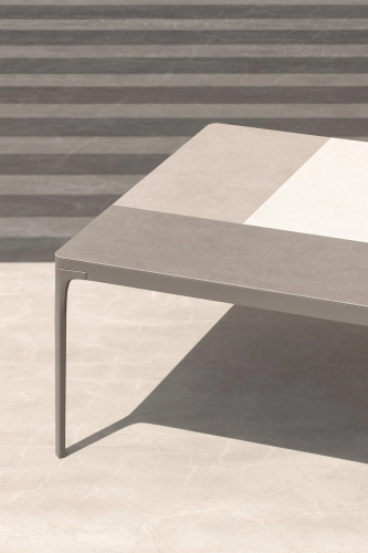 Столы Play дают возможность играть с размерами и разнообразием материалов, из которых выполнена столешница: окрашенный алюминий, натуральный тик, керамогранит с эффектом "под камень" или со специальной фактурной отделкой.