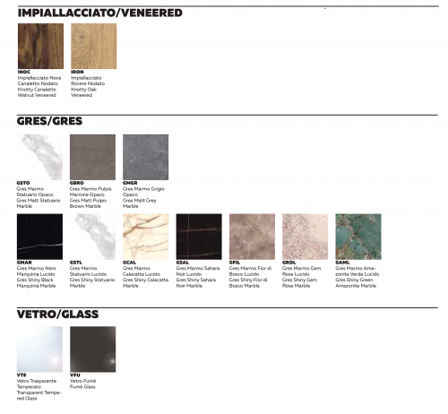 Варианты столешницы: прозрачное закаленное стекло (VTE) или дымчатое стекло (VFU) - толщина 12 мм; сучковатый шпонированный дуб (IRON) или сучковатый шпонированный орех (INOC) - толщина 25 мм; матовый мрамор - толщина 18 мм; глянцевый мрамор - толщина 18 мм.