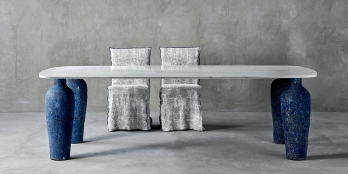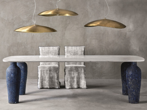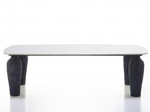Mone - это новое семейство столов - круглых, квадратных и прямоугольных - со своим специфическим характером. Керамические основания отличаются материальной и неровной поверхностью, напоминающей поверхность луны - особой голубой луны - полученной благодаря специальному принципу ручной отделки. В круглых столах центральная основа - большая скульптурная амфора, поддерживающая алюминиевую или мраморную столешницу, доступную в двух размерах.