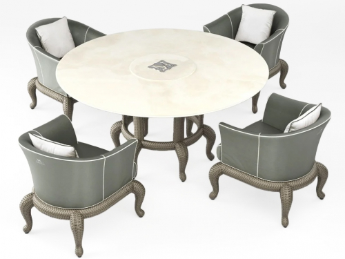 Круглый обеденный стол Canopo T2 имеет стильную столешницу, выполненную в различных вариантах отделки от стекла, керамики до мрамора, и доступен в различных размерах как квадратной, так и круглой формы. Мебель Canopo T2 изготовлена из материалов, позволяющих длительное время использовать на открытом воздухе, как и все элементы коллекции Siderale. Мебель из синтетического волокна VIRO® ручной работы, разработанная для длительного использования на открытом воздухе и, следовательно, устойчивая к любым атмосферным воздействиям. Обладает устойчивостью к перепадам температур (от -70°C до +80°C), ультрафиолетовым лучам, не теряет цвет, влагостойкостью, устойчивость к соли и хлору, плесени. Это нетоксичный экологичный материал (на 100% перерабатываемый), по ощущению как натуральный материал. Корпус мебели реализуют из крашеного алюминия, покрытого плетением из специального синтетического волокна того же цвета. Посмотреть палитру материалов Samuele Mazza.