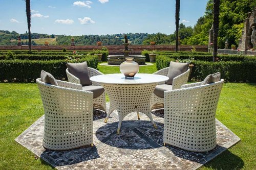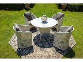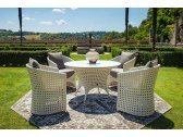 Элегантный обеденный стол Wezen с алюминиевым каркасом, оплетенным вручную искусственным ротангом, имеющим характерный узор венской соломы. Стеклянная или мраморная столешница диаметром 120 см установлена сверху. Модель отличается наличием мелких деталей, в виде ножек и элементов стеклянной опоры, выполненных с золотой отделкой.