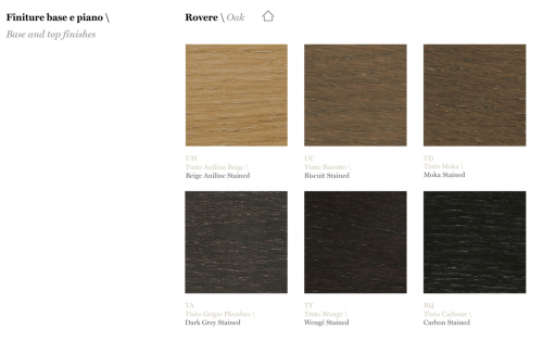 Варианты отделки древесины: анилиновый бежевый (UH), печенье (UC), мокко (TD), серый свинец (TA), венге (TY), карбон (RQ).