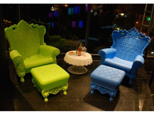 Fizzz, идеально подходящий для внутренних и наружных помещений для сферы Contract и различных мероприятий, адаптируется к пространствам благодаря основанию разной высоты и множеству цветов.