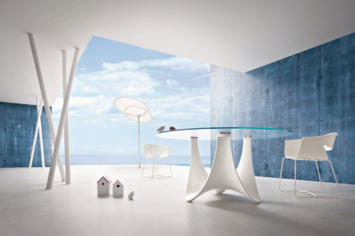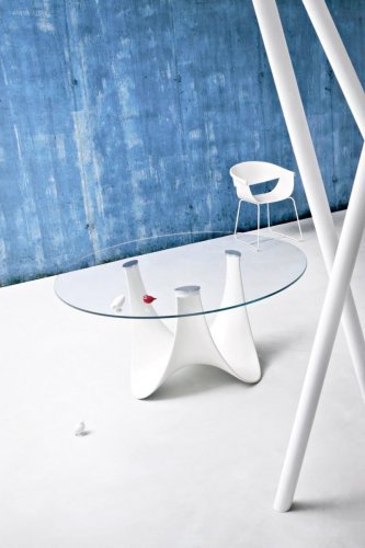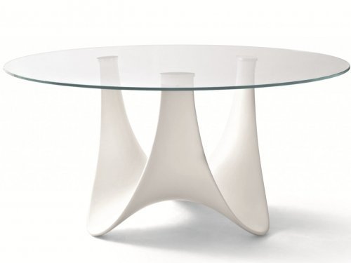 Уличный круглый стол с основанием из стеклопластика и столешницы из экстра-прозрачного закаленного стекла толщиной 12 мм. Основание из формованного стеклопластика напоминает изгибы классической скульптуры, придавая столу сильную идентичность. Подходит для внутренних интерьеров и открытых пространств на свежем воздухе.