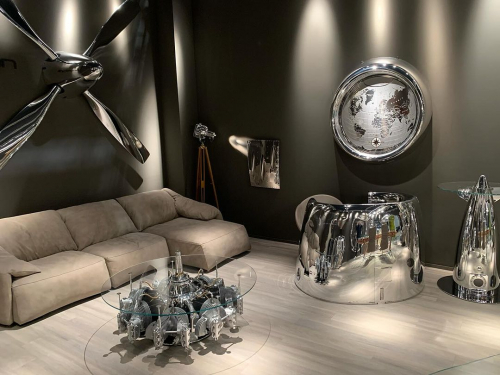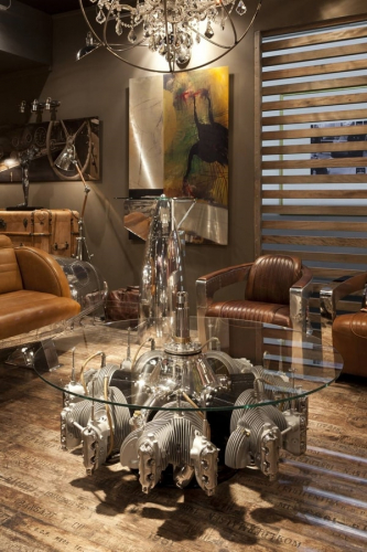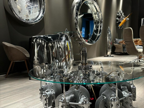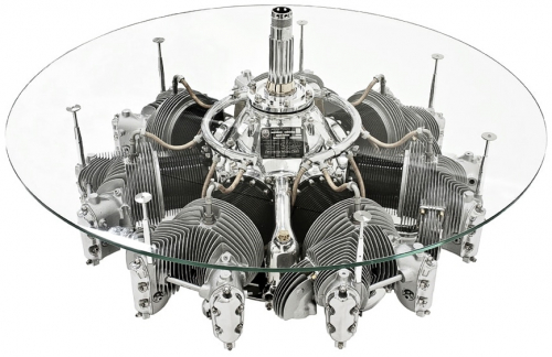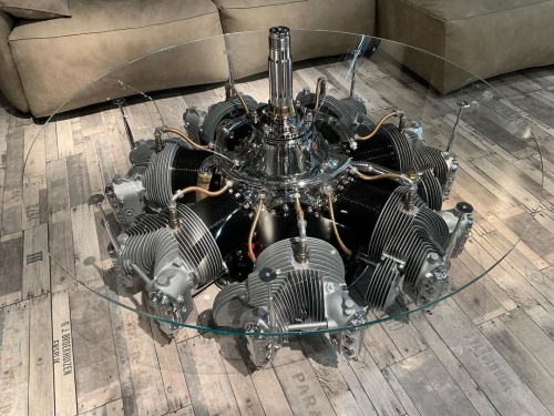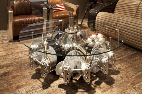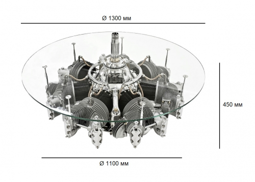 Уникальный кофейный столик Aeronautica AIR-TAV0052 - это шедевр дизайна, созданный из деталей радиального двигателя Continental. Этот столик воплощает в себе дух авиационной истории, объединяя мощные элементы авиационного двигателя с элегантностью и функциональностью современного предмета интерьера. Массивная основа из высококачественного металла и столешница из стекла придают столу прочность и изысканность, делая его центральным элементом любой комнаты. Изделие не только служит практичным столиком, но и привлекает внимание, становясь ярким акцентом и символом вашего безупречного вкуса и увлечения авиацией.