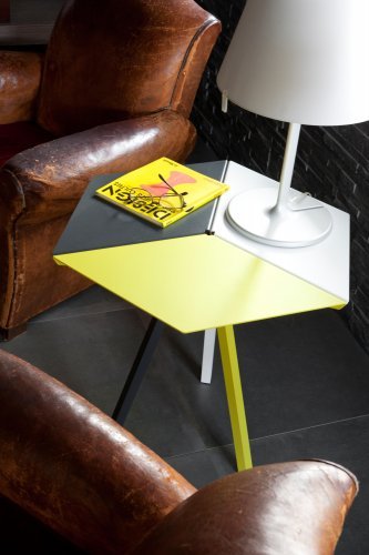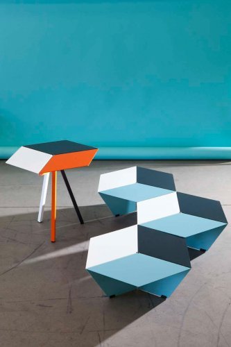 Стол-пьедестал Kuban установлен на треноге из стальных труб квадратного сечения со сторонами 2,5 см. Он выполнен в стиле ретро восьмидесятых годов. Этот кофейный столик высотой 60 см, в дополнение к своей оригинальной шестиугольной форме, является предметом мебели с широкими возможностями настройки: каждая из 3 частей, составляющих его, может быть выбрана в другом цвете среди 38, предлагаемых Matière Grise. Несколько предметов серии Kuban, расположенные вместе, производят удивительный оптический эффект и возвращают нас в атмосферу восьмидесятых, во времена кубика Рубика и первых пикселей.