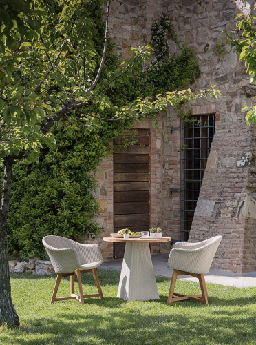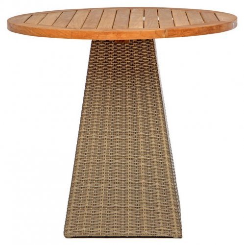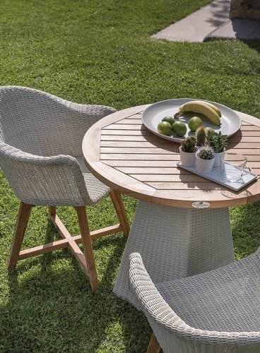 Круглый стол Gipsy с плетеным центральным основанием из синтетического ротанга. Разборная столешница из массива тикового дерева. Стол идеально подходит для использования в развлекательных заведениях или ресторанах.