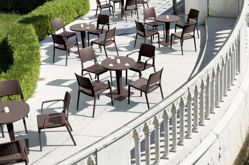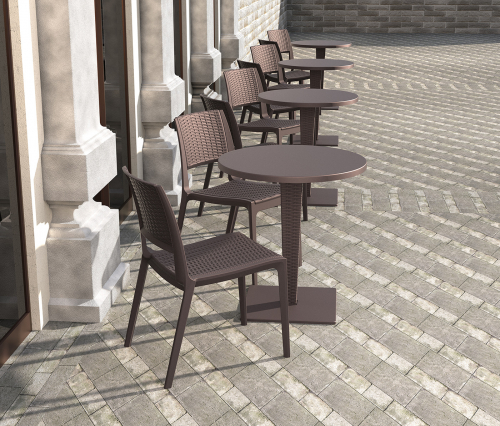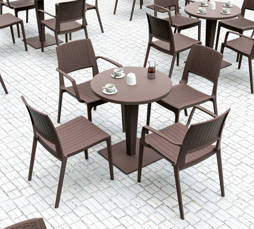Пластиковые столы серии Riva с имитацией плетения натурального ротанга станут отличным выбором для обстановки фуд-кортов, кафе, ресторанов и баров. Благодаря использованию высококачественных материалов они долгое время не теряют своего привлекательного внешнего вида, даже несмотря на активную эксплуатацию. Долговечный алюминий и устойчивые к ультрафиолетовому воздействию пластик и верзалит обеспечивают использование барных столов Riva Bar на открытых площадках.