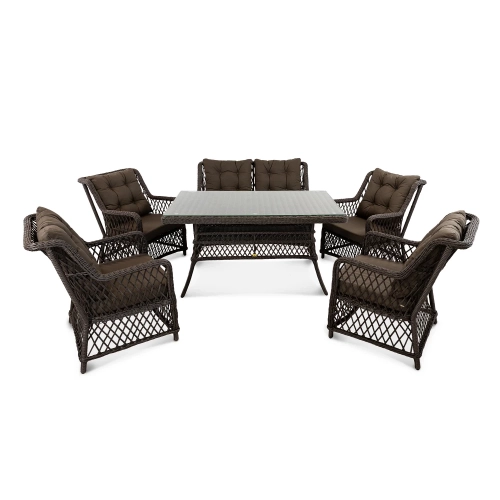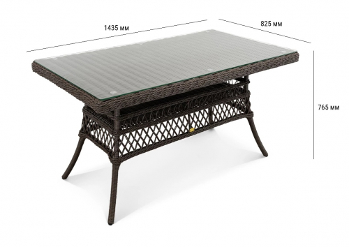 Стол Titulo прямоугольной формы рассчитан на комфортное размещение шести персон. Его прочная основа - цельносварной алюминиевый каркас с износостойким порошковым покрытием, дополненный долговечным плетением из искусственного ротанга. Практичная столешница из закаленного стекла легко вписывается в любой интерьер и неприхотлива в уходе.