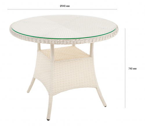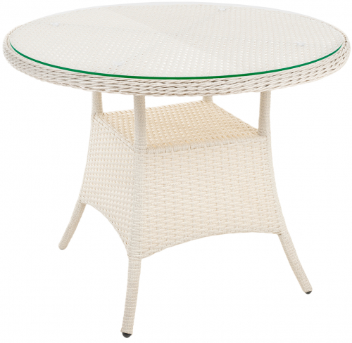 Стол Kipr круглой формы рассчитан на комфортное размещение четырех персон. Его прочная основа - цельносварной алюминиевый каркас с износостойким порошковым покрытием, дополненный долговечным плетением из искусственного ротанга. Практичная столешница из закаленного стекла легко вписывается в любой интерьер и неприхотлива в уходе.