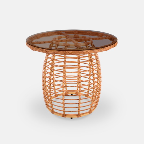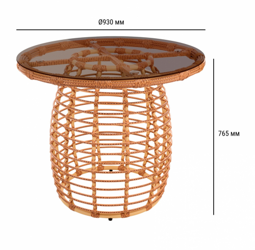 Закаленное стекло защищает ажурное плетение трубчатого ротанга, создавая визуальную глубину (каждый завиток ротанга виден как на ладони), практичность и контраст текстур (холод стекла + тепло ручного плетения).
