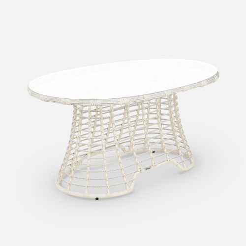 Стол Lotus с элегантной овальной столешницей создан для объединения людей. Плавные, лишенные острых углов линии формируют комфортную и гостеприимную атмосферу, идеальную для неспешных обедов и теплого общения. Визуальную глубину и уникальный характер модели подчеркивает многослойная структура: под прочной столешницей из закаленного стекла скрывается тонкое ажурное плетение искусственного ротанга. Эта игра текстур и материалов создает динамичный световой эффект, где блики естественного или искусственного света оживляют поверхность, добавляя сервировке особый шарм.