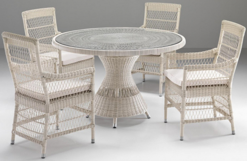 Коллекция уличной мебели Camille с алюминиевым каркасом и плетением из полиэтиленового волокна REHAU. Эти материалы идеально подходят для использования на улице, большой круглый стол диаметром 1200 мм станет элегантной частью частных и коммерческих летних площадок.