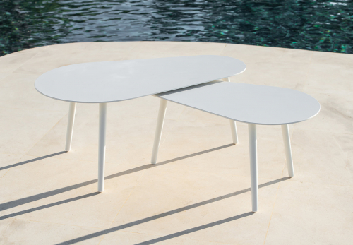Комплект Amazone состоит из двух журнальных столиков, которые можно сдвинуть вместе. Оба стола полностью изготовлены из алюминия: ножки из круглой профильной трубы, столешница из прочного алюминия. Эти журнальные столики хорошо сочетаются со всеми сериями Jati & Kebon.