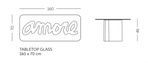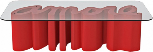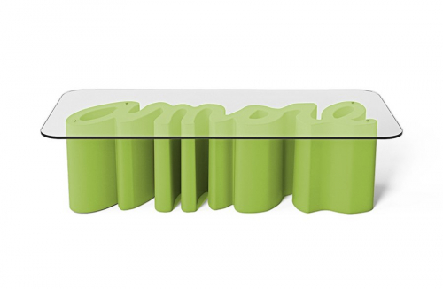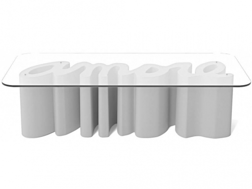 Amore Table представляет собой стол со структурой, выполненной со стилизованной надписью Amore и прозрачной закаленной стеклянной столешницей. Стол Amore относится к необычному проекту с философией надписи, сделанной Giò Colonna Romano: слово становится элементом дизайна и материализуется, становится продуктом, который может передавать сообщение.