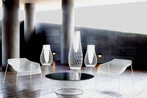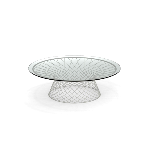 Тонкий плетеный стальной каркас является отличительной чертой коллекции, отмеченной стройными линиями и общей гармонией. Стальные стулья в паре с прозрачными стеклянными столешницами "освещают" поверхность стола, придавая им непостижимое качество.