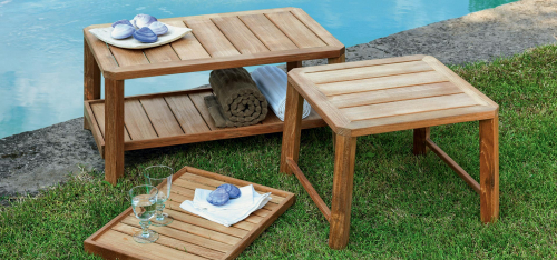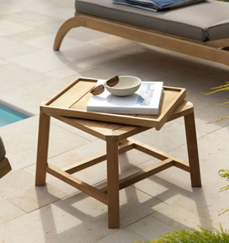 Журнальные столики со съемным подносом в двух размерах представлены с отделкой из натурального тика или мореногос её очаровательным "потертым" видом.