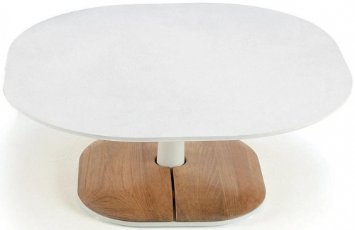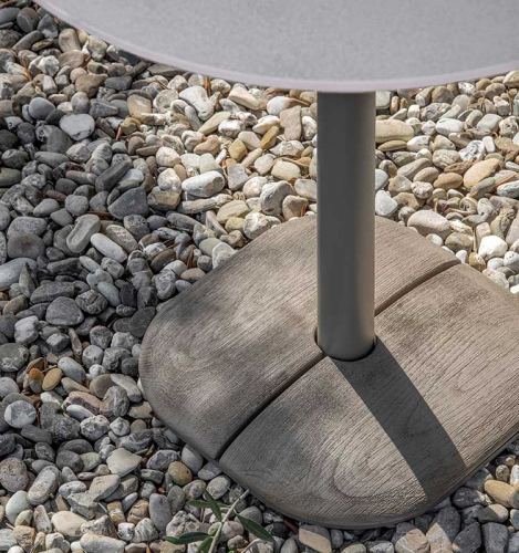 Металлическая коническая конструкция, которая поддерживает столешницу, опирается на основание, которое может быть закрыто крышкой из натурального или мореноготика.