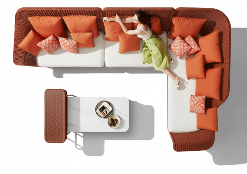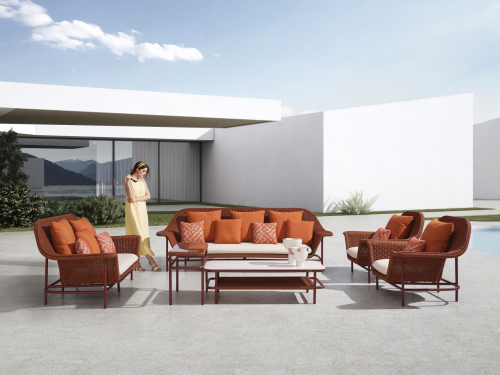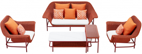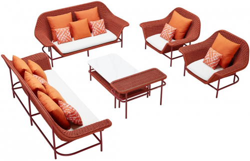 Набор для террасы и сада Lisboa состоит из 3-местного дивана, 2-местного дивана, двух удобных кресел, кофейного столика и бокового столика, который при необходимости можно расположить между креслами. Кофейный столик создан из уникального сочетания материалов: алюминия и веревки, со столешницей из спеченного камня, а боковой столик имеет прозрачную стеклянную столешницу. Подушки изготовлены из прочного текстиля, идеально подходящего для уличной мебели, и наполнены быстросохнущей пеной. Применение специально разработанных материалов позволяет использовать коллекцию на открытом воздухе в полной безопасности, обеспечивая максимальную защиту от атмосферных воздействий без ущерба для эстетики и комфорта.
