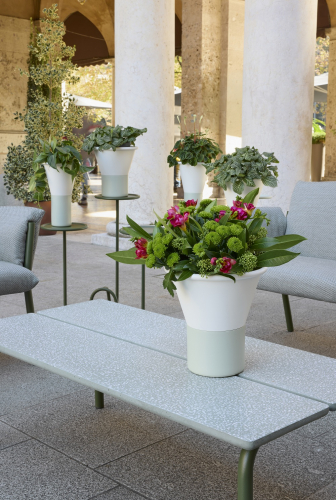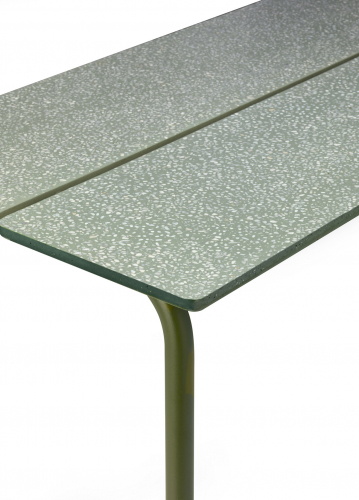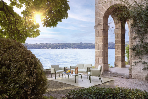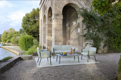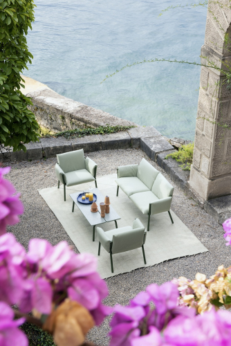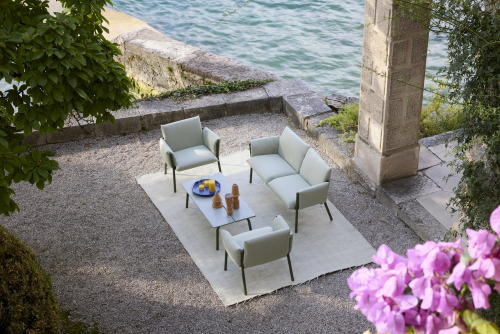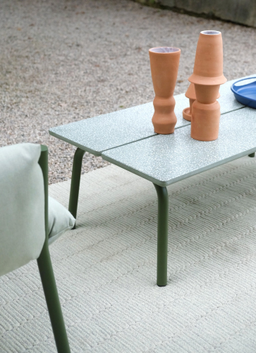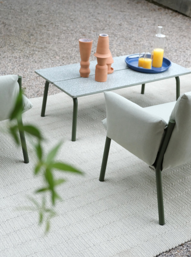 Для обеспечения большей адаптации к особенностям любого пространства и облегчения конфигурации мест отдыха на открытом воздухе коллекция Brezza включила в себя низкий кофейный столик, характеризующийся двумя большими планками, доступный в версии со столешницей из бетона или HPL.