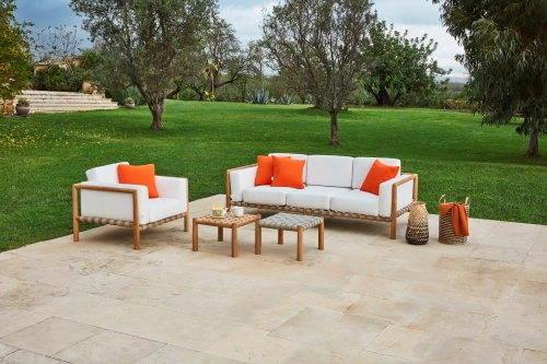 Вся мебель коллекции, от диванов, кресел и столиков для гостиной до обеденных кресел и столов, а также шезлонгов и лаунж-диванов, характеризуется обработкой тика мягкими, округлыми и изящными линиями. Эти линии не только радуют глаз, но и гарантируют максимальный комфорт. Геометрические рамы и вдохновленное Востоком плетение из ремней, выполненное вручную, подчеркивают культуру искусной обработки, присущую Unopiù.