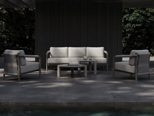 Коллекция включает в себя кресло, двухместный и трехместный диваны, журнальный столик, шезлонг и кушетку, образуя полноценный комплект мебели для отдыха на открытом воздухе, выдержанный в едином стиле. Обеденный гарнитур продолжает эту концепцию благодаря тому же структурированному алюминиевому каркасу, обеспечивая визуальную гармонию всех типов мебели.
