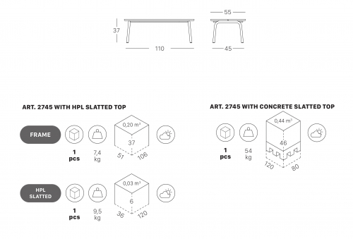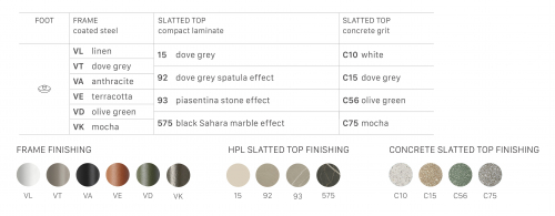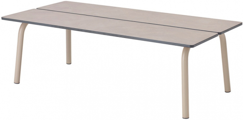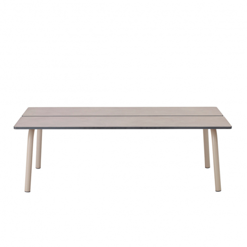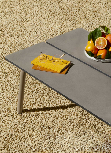 Для обеспечения большей адаптации к особенностям любого пространства и облегчения конфигурации мест отдыха на открытом воздухе коллекция Brezza включила в себя низкий кофейный столик, характеризующийся двумя большими планками, доступный в версии со столешницей из бетона или HPL.
