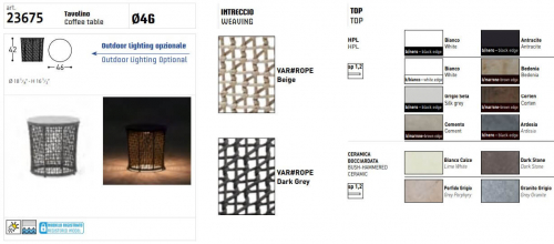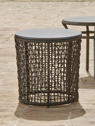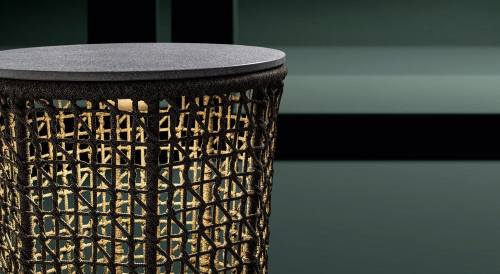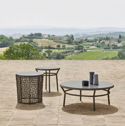 Журнальный столик со столешницей из HPL или керамики, поддерживаемой крепким алюминиевым каркасом с порошковым покрытием, который оплетен роупом ручной работы. Легкий, прочный и стабильный, он выделяется элегантной оригинальностью своего внешнего вида.