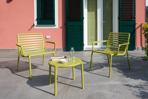 Свежая, легкая и эргономичная, Doga - это новая очаровательная коллекция уличной мебели: стулья с подлокотниками и без них, кресло для отдыха и моноблочный журнальный столик из стеклопластика (полипропилен и стекловолокно). Вся коллекция была вдохновлена решетчатым дизайном, но Рафаэлло Галиотто, ее дизайнер, придал ей современный оттенок. Плавные линии спинки и сиденья стульев характеризуются игрой заполнений и пустот, отмеченных последовательностью горизонтальных планок.