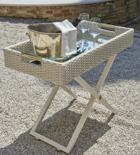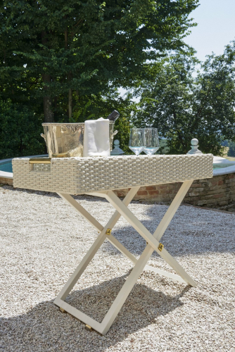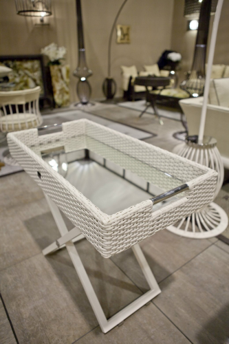 Плетеный столик Canopo со столешницей из закаленного зеркала толщиной 10 мм предназначен для использования на открытом воздухе. Основание из обработанного железа, регулируемое по 2 разным высотам. Съемный поднос из плетеного синтетического волокна ручной работы. Рокошные хромированные или позолоченные боковые ручки. Плетеный поднос также доступнен в других вариантах отделки: стекло, стекло с печатью под оникс, керамика с отделкой под мрамор.