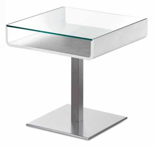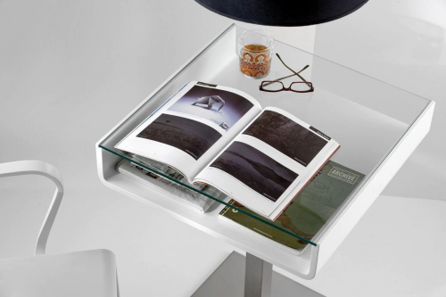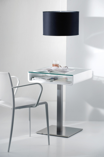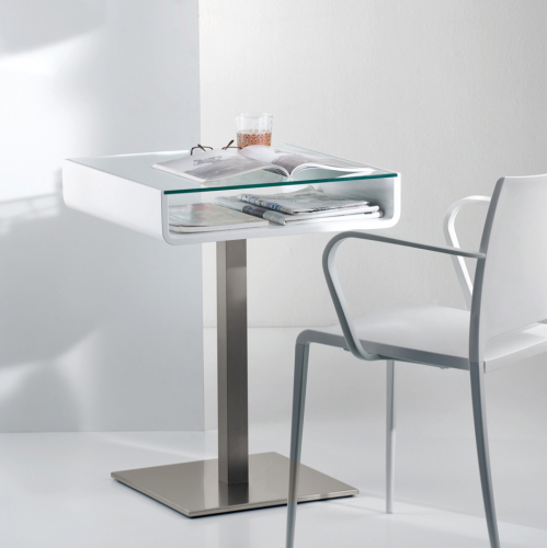 Стол Inox Multifunzionale – это уникальное изделие, обладающее привлекательным внешним видом и большим функционалом. Прозрачная столешница из закаленного стекла опирается на изогнутую шпонированную фанеру, покрытую блестящим белым лаком. Нижняя полка становится еще одной практичной и удобной деталью. Ее можно использовать для удобного расположения личных вещей, журналов, книг и любых других предметов. Это прекрасная модель для оформления баров и кафетериев.