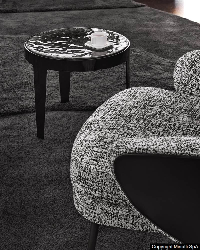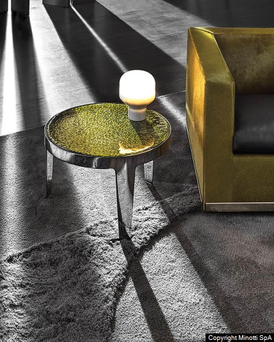 Цветная столешница, которая играет с прозрачностью и текстурой стекла, обработанного с помощью специального процесса плавления, является отличительной чертой журнального столика Grant. Выполненный из металла, он имеет цельный каркас в форме короны, с ножками, сужающимися к низу. Тактильная чувственность столешницы с ее слегка волнистой поверхностью, характерной для предметов из плавленого стекла, контрастирует с пластичностью форм, придающих простому предмету интерьера ощущение скульптуры.