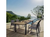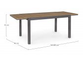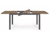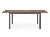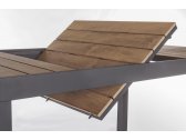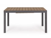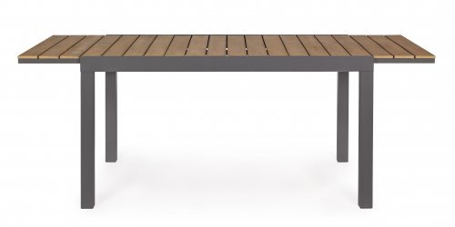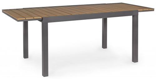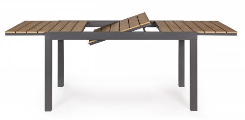 Раздвижной стол Elias имеет возможность регулировки длины от 1400 мм до 2000 мм, благодаря чему за ним может разместиться 6 человек. Каркас из алюминия с порошковым покрытием (полиэстер), разборные ножки, винты из оцинкованной стали. Столешница выполнена из ДПК (композитный материал, похожий на дерево: 90% полистирол 10% sbs) с отделкой под тик.
