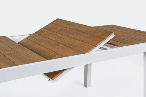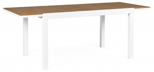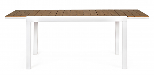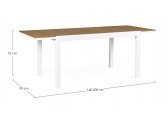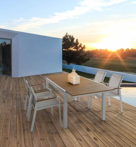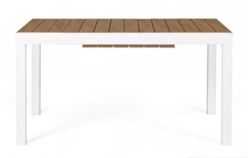 Раздвижной стол Elias имеет возможность регулировки длины от 1400 мм до 2000 мм, благодаря чему за ним может разместиться 6 человек. Каркас из алюминия с порошковым покрытием (полиэстер), разборные ножки, винты из оцинкованной стали. Столешница выполнена из ДПК (композитный материал, похожий на дерево: 90% полистирол 10% sbs) с отделкой под тик.