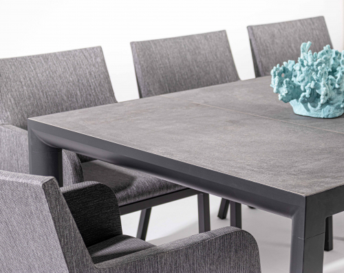 Обеденный стол Mason станет украшением любого открытого пространства, благодаря стильной керамической столешнице толщиной 10 мм. Каркас с разборными ножками выполнен из алюминия с порошковым покрытием (полиэстер), что обеспечивает устойчивость и долговечность конструкции. Стол предназначен для размещения 8 персон.