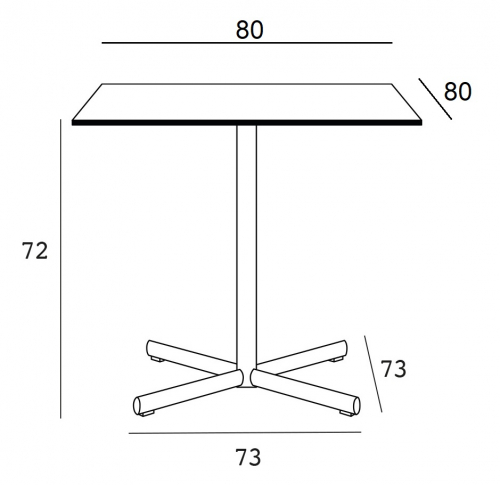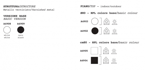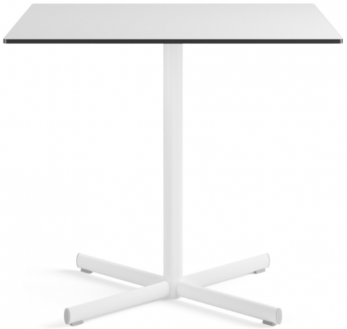 Стол Fade имеет центральную одинарную опору и четыре горизонтальные ножки с регулируемыми подпятниками. Напольная крестовина из литого под давлением алюминия позволяет установить HPL-столешницу как круглой (диаметр 800 мм), так и квадратной формы (800х800 мм). Специальная окраска делает стол пригодным для использования как внутри, так и снаружи.