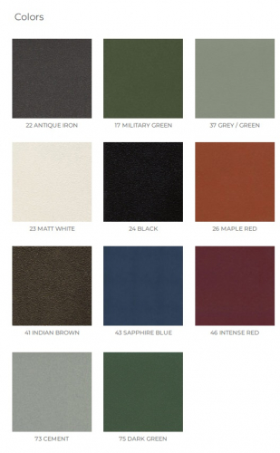 Материал: окрашенная сталь. Состав: железо и углеродный сплав с содержанием углерода менее 2%, обработанные, чтобы выдерживать воздействия окружающей среды, с помощью уникально антикоррозионной обработки EMU-Coat.
