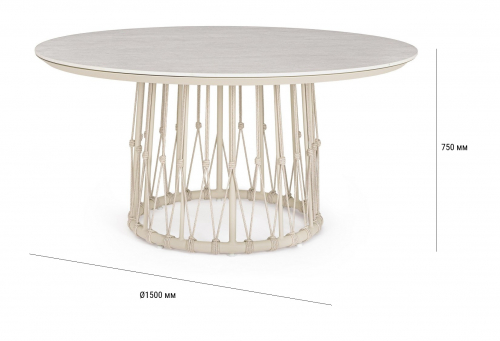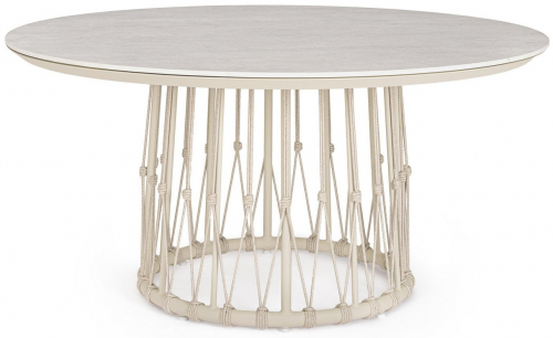 Lanai - роскошный круглый обеденный стол, который сочетает в себе монументальность формы и легкость выразительного дизайна. Столешница из спеченного камня толщиной 12 мм - это натуральный материал, обработанный при экстремально высоких температурах, что обеспечивает исключительную прочность, устойчивость к царапинам, термическим воздействиям и простоту в уходе. Основание из алюминия с порошковым покрытием декорировано эффектным плетением из водоотталкивающих полиэстеровых канатов, устойчивых к УФ-излучению, что придает модели уникальный визуальный объем и текстурность.