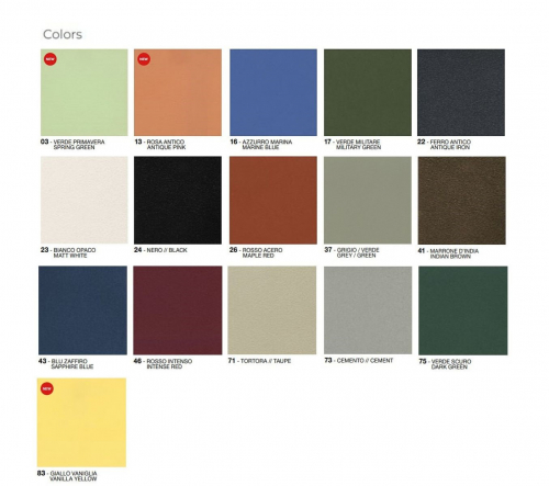 Материал: окрашенная сталь. Состав: железо и углеродный сплав с содержанием углерода менее 2%, обработанные, чтобы выдерживать воздействия окружающей среды, с помощью уникально антикоррозионной обработки EMU-Coat.