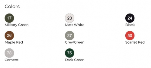 Возможные цвета: зеленый милитари (17), матовый белый (23), черный (24), кленовый красный (26), серо-зеленый (37), алый (50), цемент (73), темно-зеленый (75).