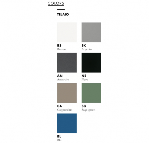 Варианты отделки: капучино (CA), зеленый шалфей (SG), белый (BS), серебристый (SK), антрацит (AN), черный (NE), синий (BL).