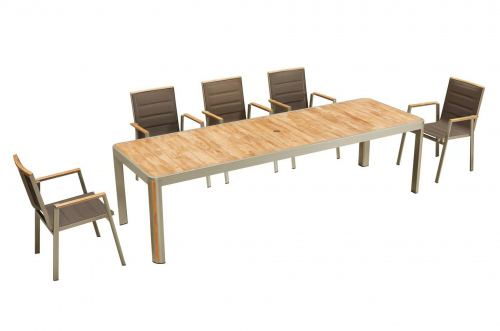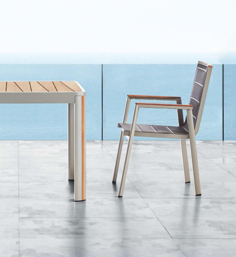Обеденные кресла и стол выделяются своей простотой и способностью улучшать пространство на свежем воздухе. Идеально подходят для проведения обеденных моментов, где веселье и расслабление взаимодействуют друг с другом в унисон. Идеальное сочетание материалов: тепло, исходящее от тика с одной стороны, и прочность алюминия в конструкции с другой. Обеденный набор Geneva - это удачное дополнение к Вашему открытому пространству! Он отлично подходит для летних дней, для проведения обеда в тени и прохладе, для хорошего самочувствия и веселья с близкими, ведь с нем каждая деталь посвящена удовольствию.