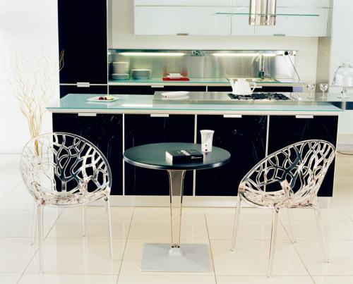 Пластиковый стол Ice представляет собой элегантное соединение нескольких материалов. Столешница выполнена из верзалита, колонна - из прозрачного поликарбоната, основание - из окрашенного алюминия.