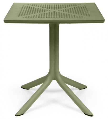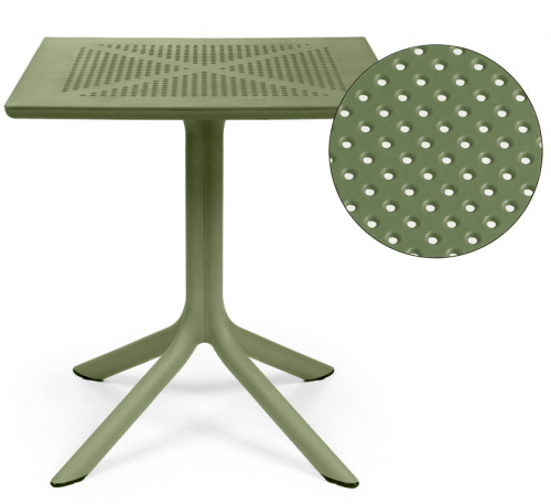 Специально разработанный для того, чтобы занимать очень мало места, Clip представляет собой профессиональный квадратный стол из стеклопластика, состоящий из центральной колонны с 4-мя ножками и столешницы DurelTop, на которой выгравирован круглый перфорированный рисунок.