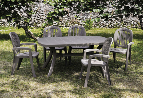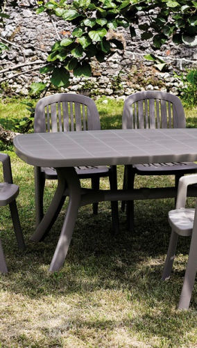 Стол из полипропилена со съемной прямоугольной столешницей выполнен в простом цвете и строгом лаконичном стиле, предназначен для использования на улице.