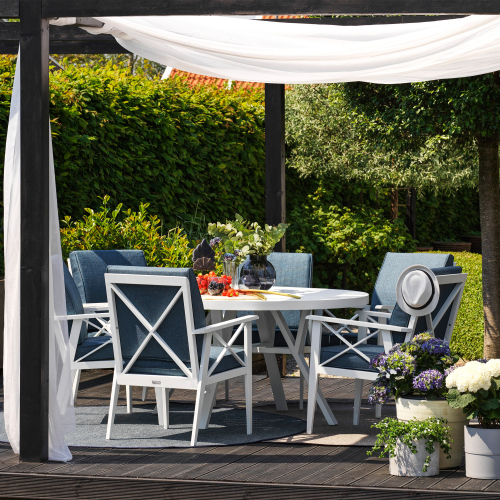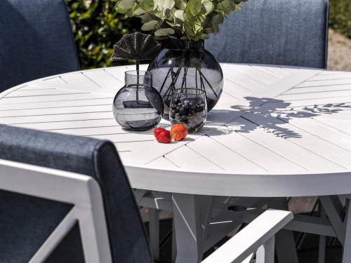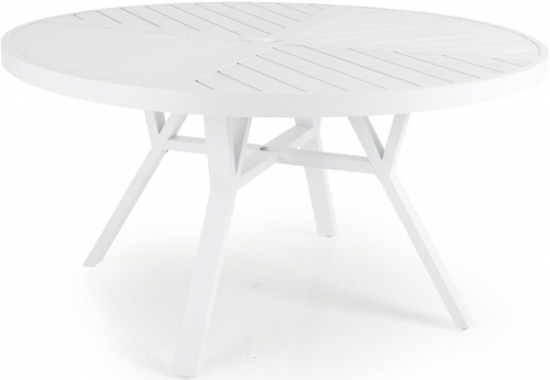 Обеденный стол из коллекции Sottenville. Классический дизайн, вдохновленный вневременной эстетикой. Коллекция выполнена из белого алюминия с коническими ножками и столешницей из тисненых алюминиевых планок. В сочетании со креслами стол создаст красивую и комфортную обеденную зону на летней площадке.